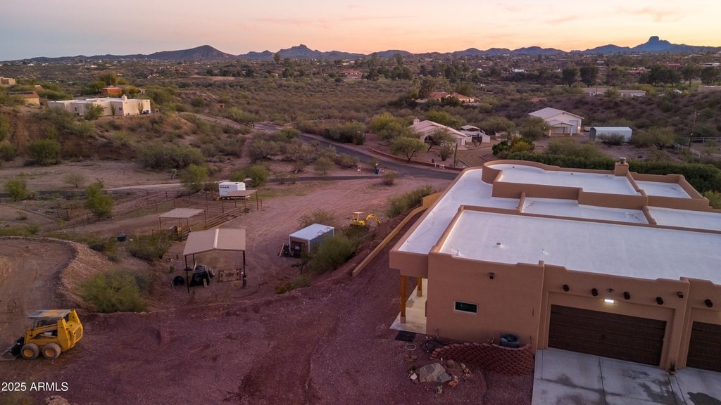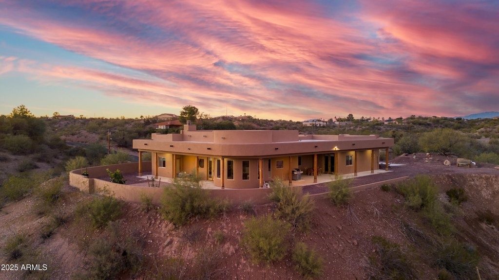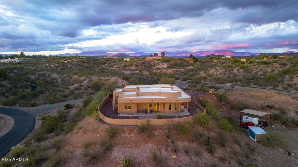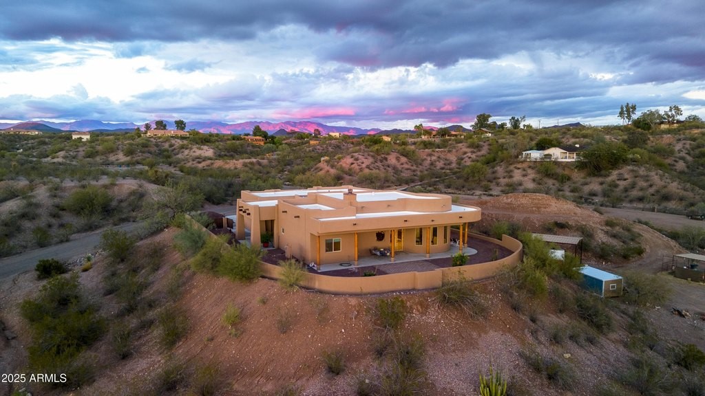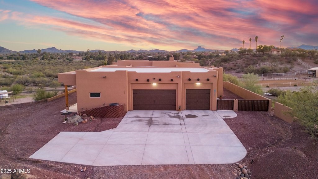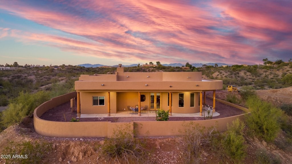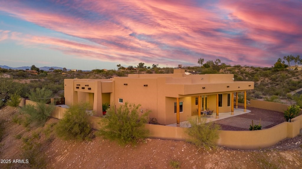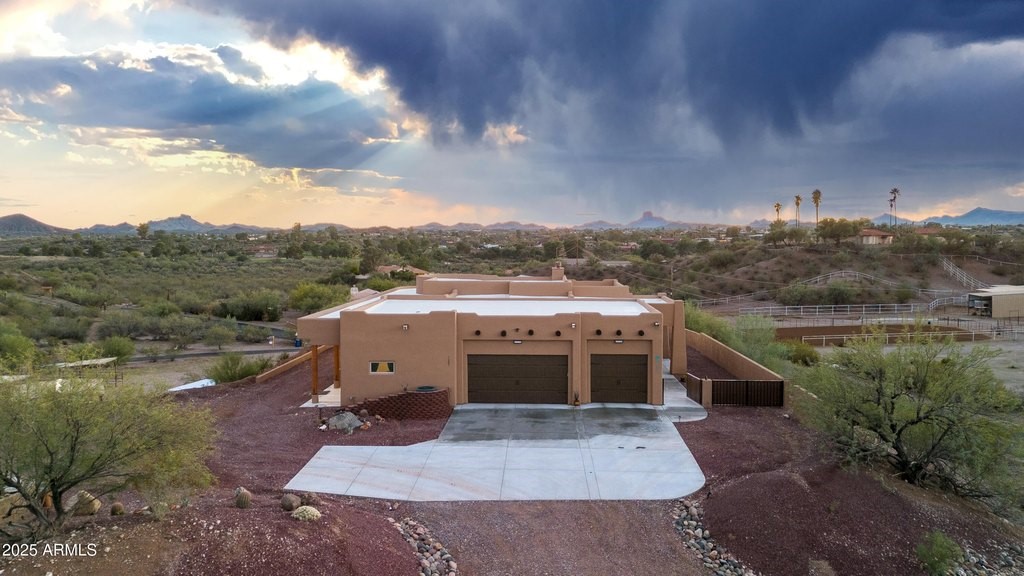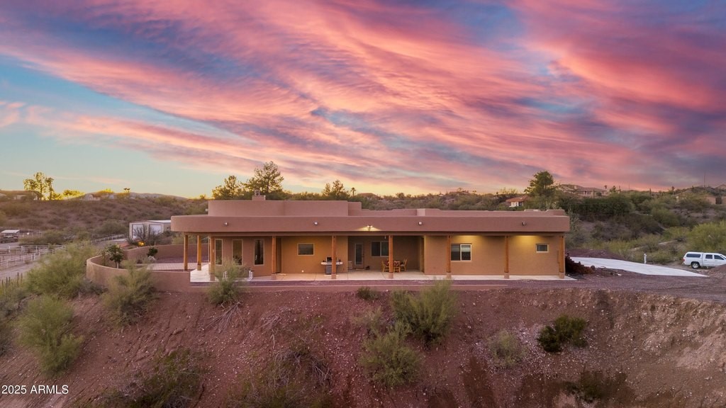 Southwestern charm and modern design in this newly constructed custom home, completed in November 2023. Offering 2,280 sq. ft. of living space and 1,310 sq. ft. of covered patios (over 4,430 sq. ft. under roof), this property was thoughtfully designed for comfort, entertaining, and equestrian living. Step inside to find two spacious master suites, each with private patio access and walk-in closets. The main suite features a luxurious walk-in shower with dual shower head separate tub. Gourmet kitchen with custom knotty alder cabinets, travertine floors and granite countertops. Custom beehive fireplace and panoramic views from this home. RV Hookup, Covered storage, Tack Room, Two large stalls and easy trailer parking, paved street. 400 Amp service ready for you to put in a barn/casita,