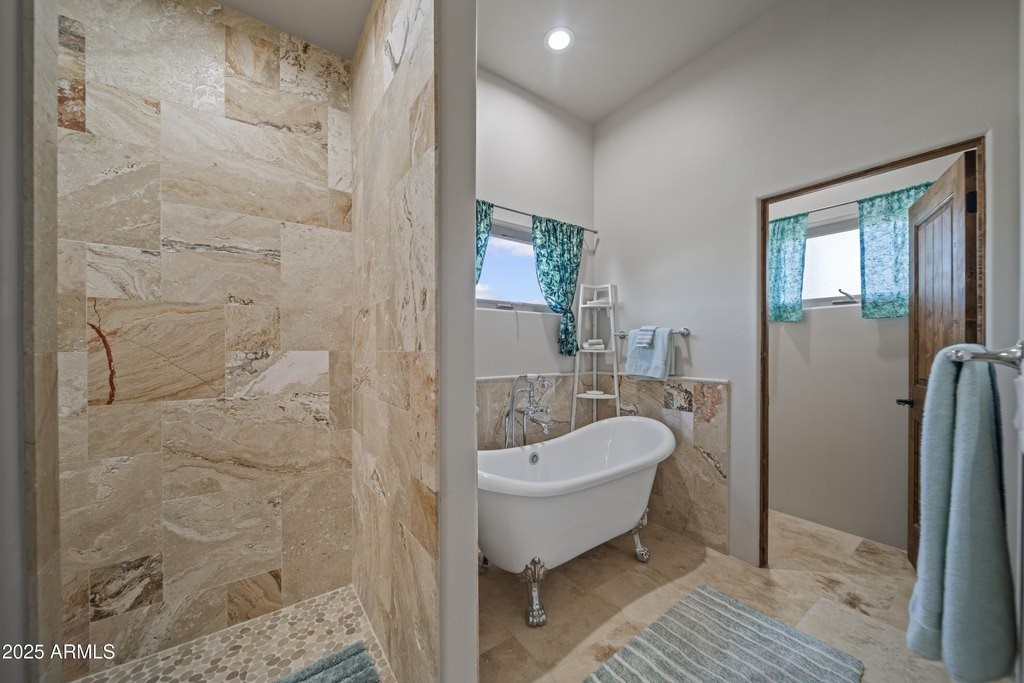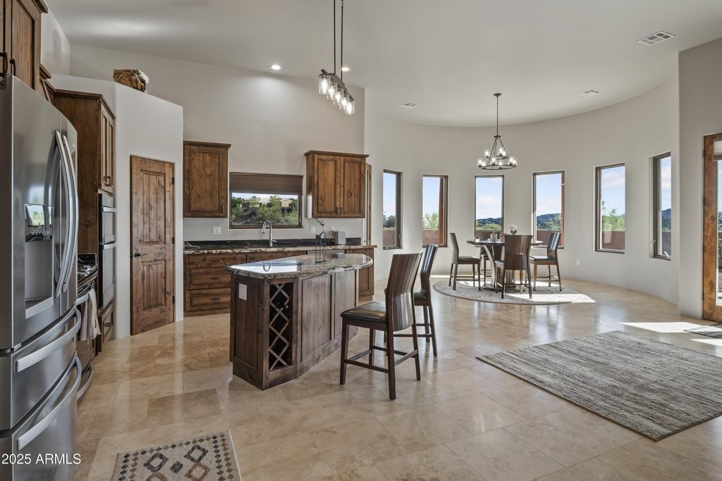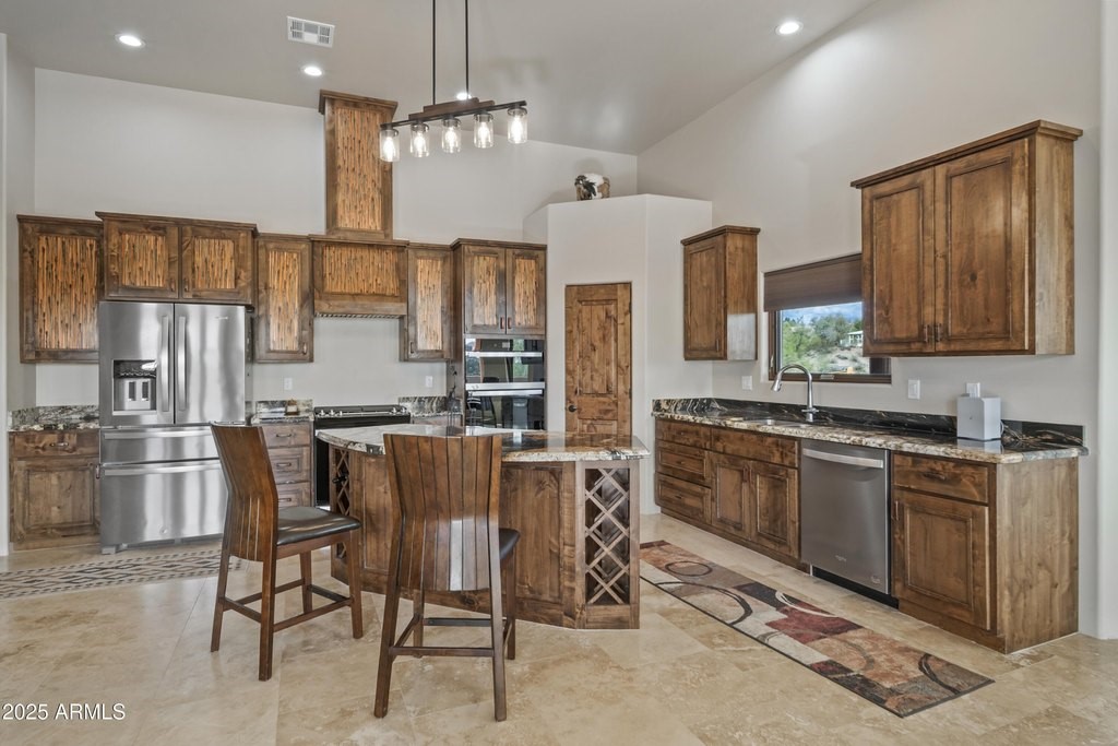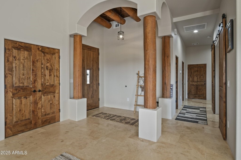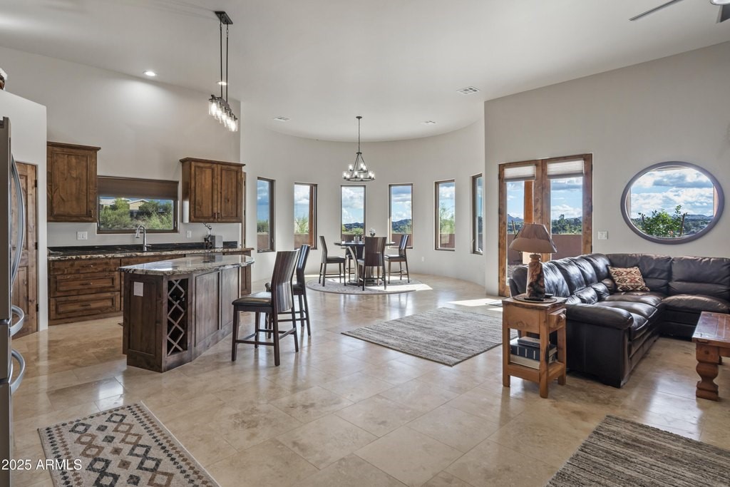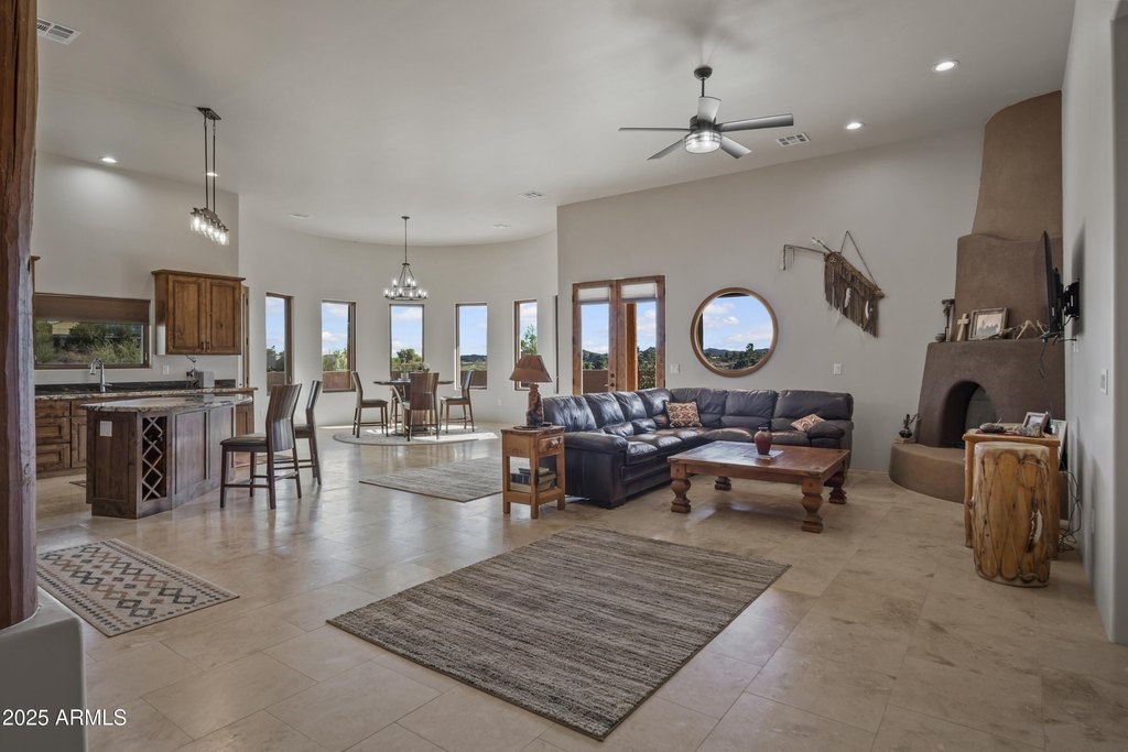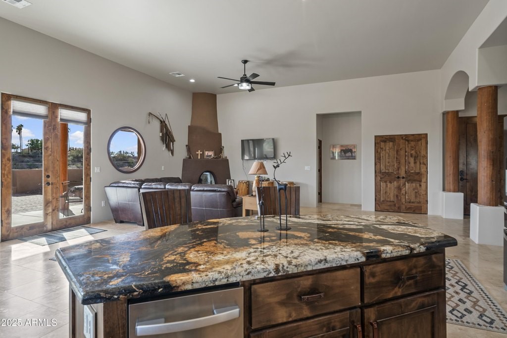 Southwestern charm and modern design in this newly constructed custom home, completed in November 2023. Offering 2,280 sq. ft. of living space and 1,310 sq. ft. of covered patios (over 4,430 sq. ft. under roof), this property was thoughtfully designed for comfort, entertaining, and equestrian living. Step inside to find two spacious master suites, each with private patio access and walk-in closets. The main suite features a luxurious walk-in shower with dual shower head separate tub. Gourmet kitchen with custom knotty alder cabinets, travertine floors and granite countertops. Custom beehive fireplace and panoramic views from this home. RV Hookup, Covered storage, Tack Room, Two large stalls and easy trailer parking, paved street. 400 Amp service ready for you to put in a barn/casita,
